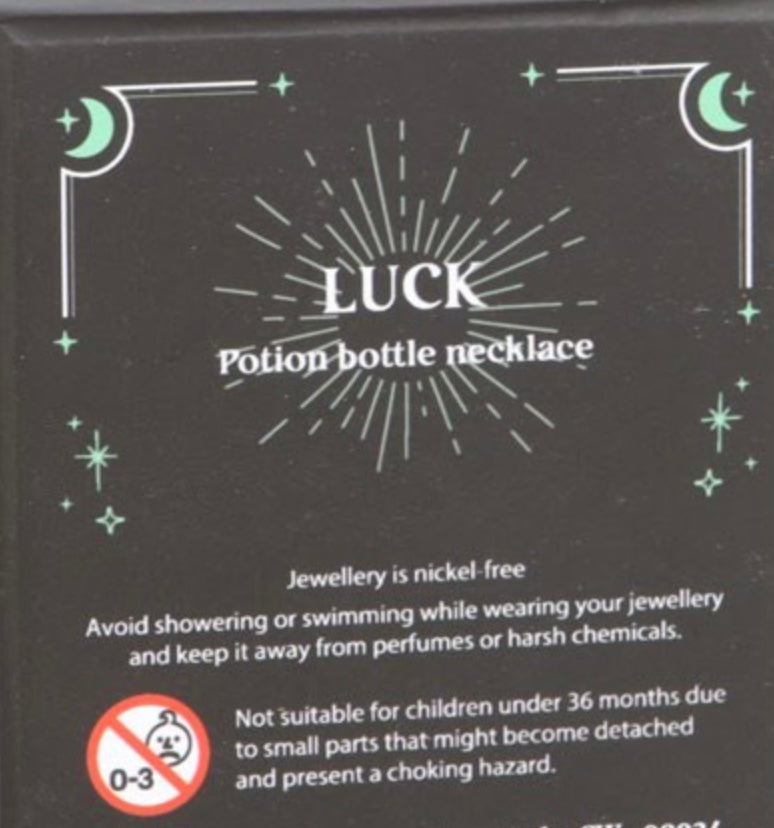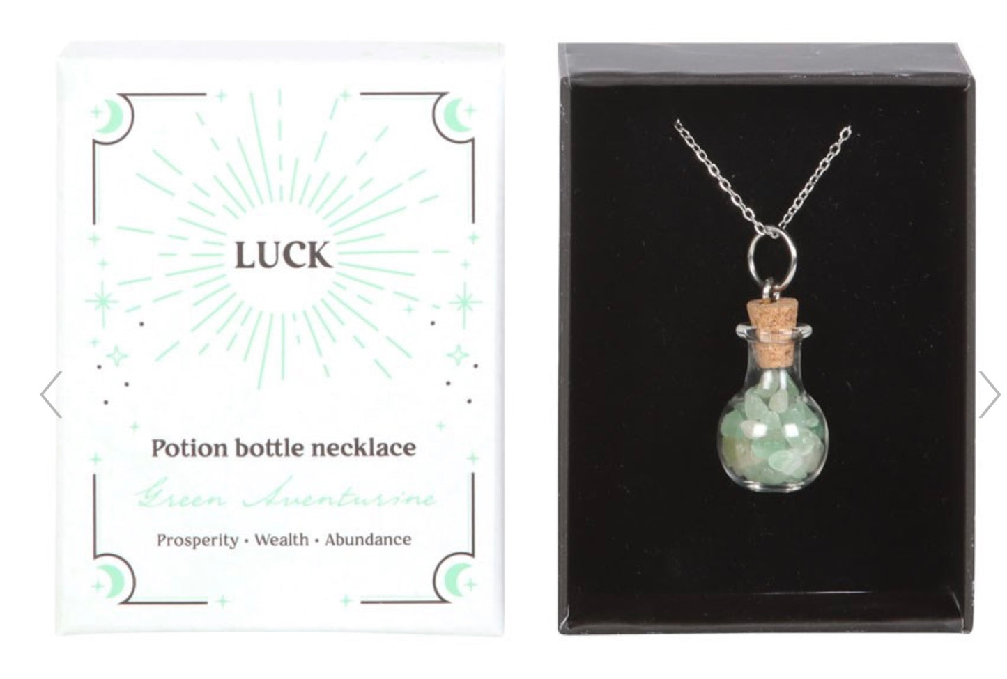 Bring a touch of magic into your life with our Green Aventurine Potion Bottle Necklace. The natural green aventurine crystal chips and cork stopper attract luck, wealth, and prosperity, while the stylish pendant adds a spellbinding charm to your look. Perfect for witches and anyone in need of some good fortune. Comes in a matching gift box.