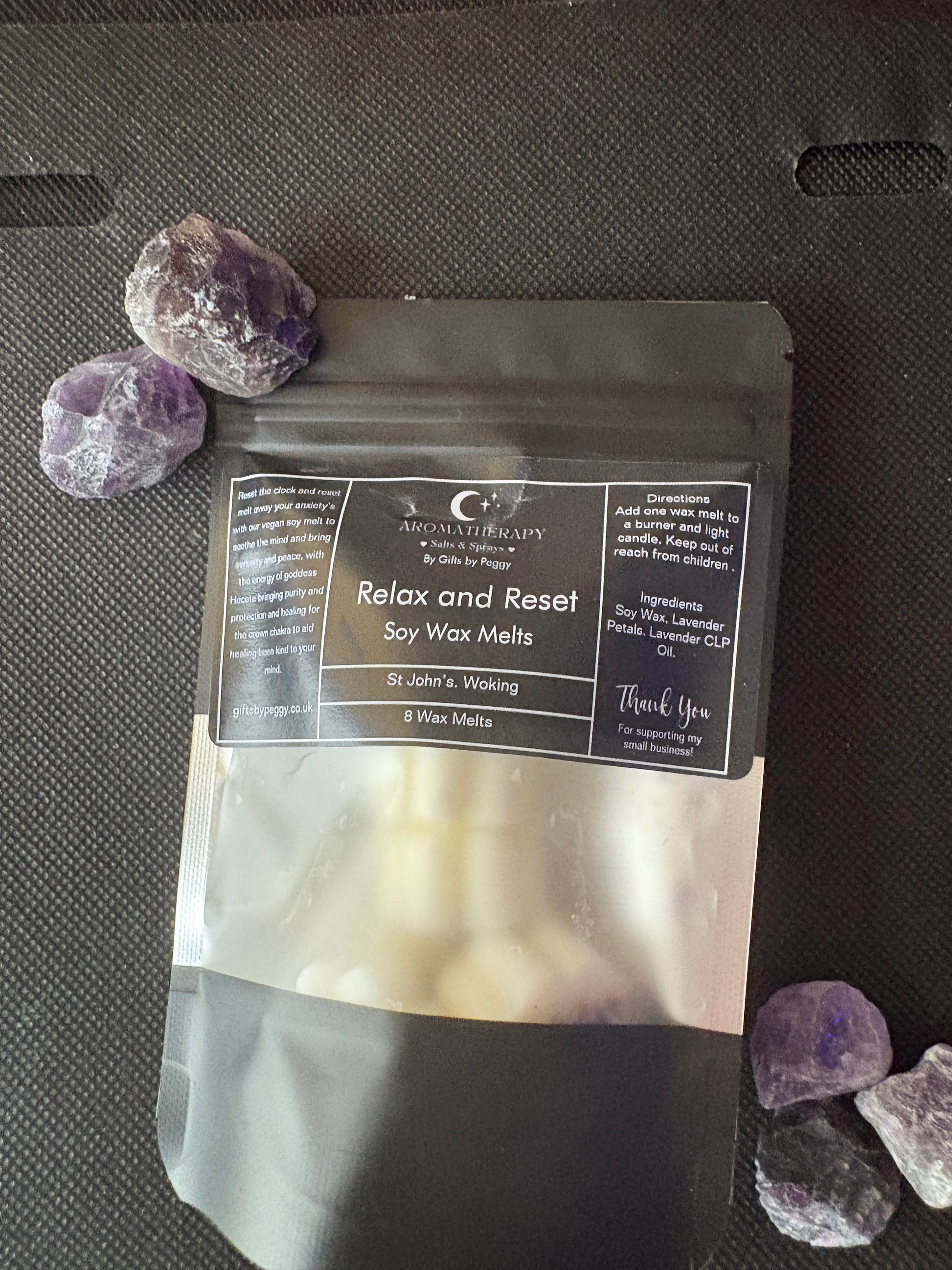 Soothe your senses and reconnect with your inner peace through the calming energy of our Relax and Reset Soy Wax Melts. Handcrafted with intention in St John’s, Woking, each melt is infused with lavender petals and lavender essential oil, chosen for their gentle, therapeutic properties.