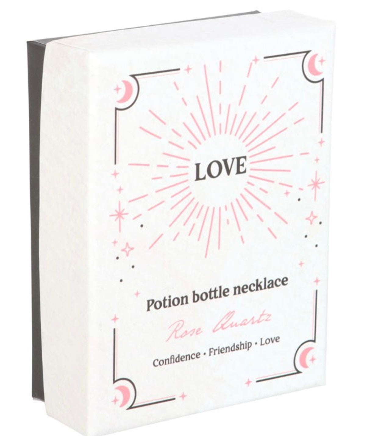 Channel your inner witch with this daring Rose Quartz Potion bottle necklace. Crafted with natural rose quartz crystal chips, this necklace is perfect for attracting love, friendship, and confidence. The cork stopper and mini bottle add a touch of magic to your look. Comes in a gift box, making it the perfect gift for any adventurous soul.